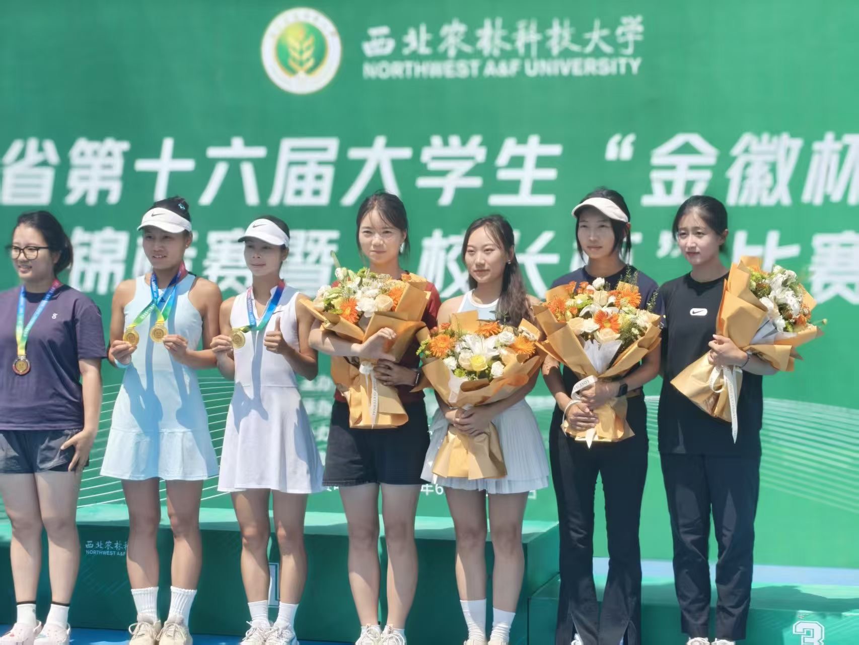 6 月 25 日上午,陕西省第十六届大学生网球锦标赛暨 校长杯 比赛在西北农林科技大学网球场隆重开幕。本次比赛我校夺得男子甲组团体、单打、双打三枚金牌,单打银牌。女子甲组团体铜牌、双打铜牌,以及多项第五的历史性成绩。本次赛事由陕西省学生体育协会主办,西北农林科技大学承办,陕西省学生体育协会网球专业委员会协办,以深入推进高校阳光体育运动、丰富校园体育文化内涵、搭建高水平赛事交流平台为目标,吸引了全省 29 所高校的 230 余名运动员同场竞技。赛事为期 5 天。 我校 15 名运动员在领队体育部(系)主任杭兰平,教练黄一平老师和刘泳江老师的带领下参赛,以五育融合 的育人理念为指引,在赛场上既展现竞技实力,更传递全面发展的精神风貌。