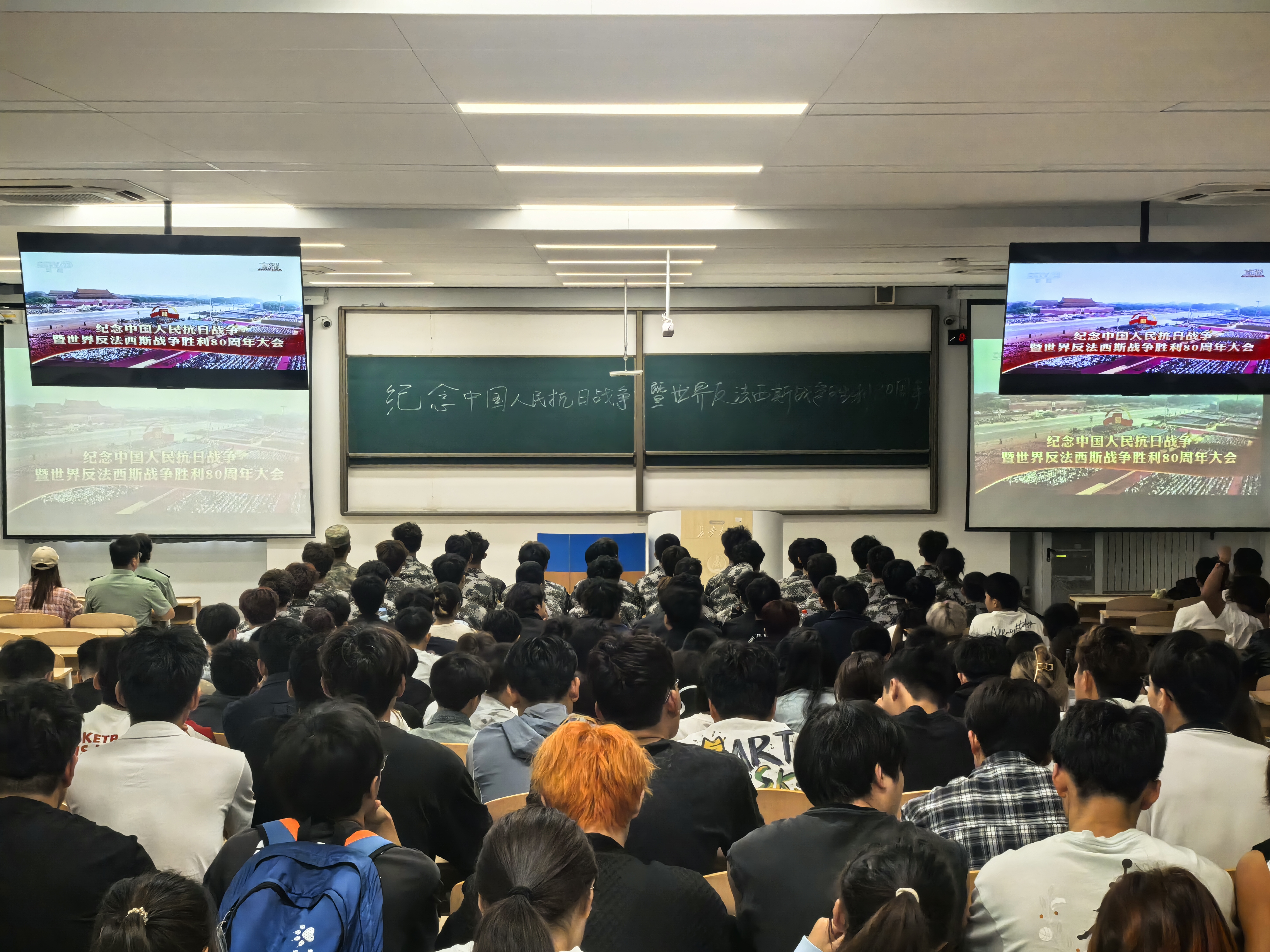 9月3日,纪念中国人民抗日战争暨世界反法西斯战争胜利80周年大会在北京天安门广场隆重举行。我部(系)组织全体师生分别在体育部(系)二层会议室、WH1103教室集中观看了大会现场直播。
